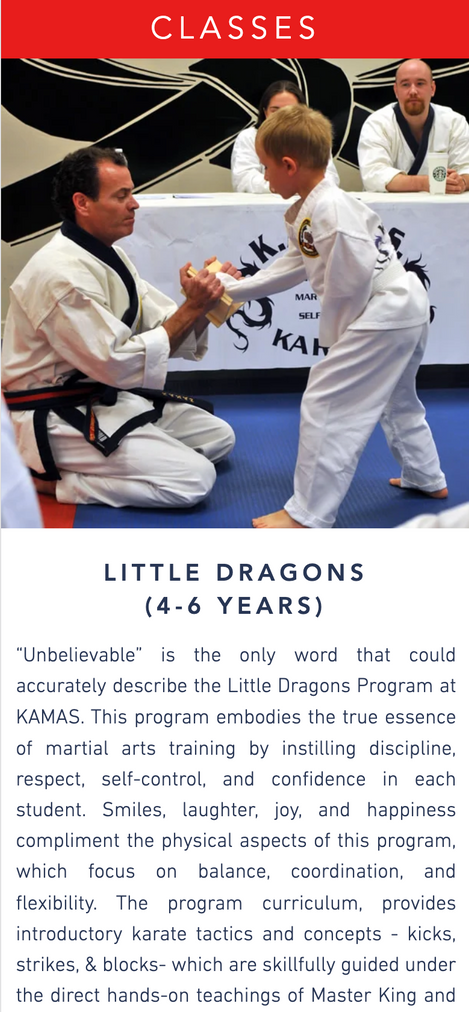 Based on the KAMAS logo that contains navy and purple, I enhanced the website by adding red, a common color seen throughout martial arts. Red symbolizes a setting sun and represents strength, passion, and power. That seemed pretty appropriate for a Tang Soo Do studio!